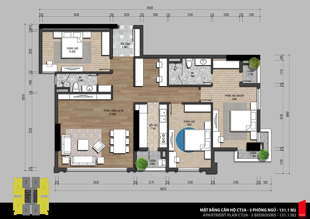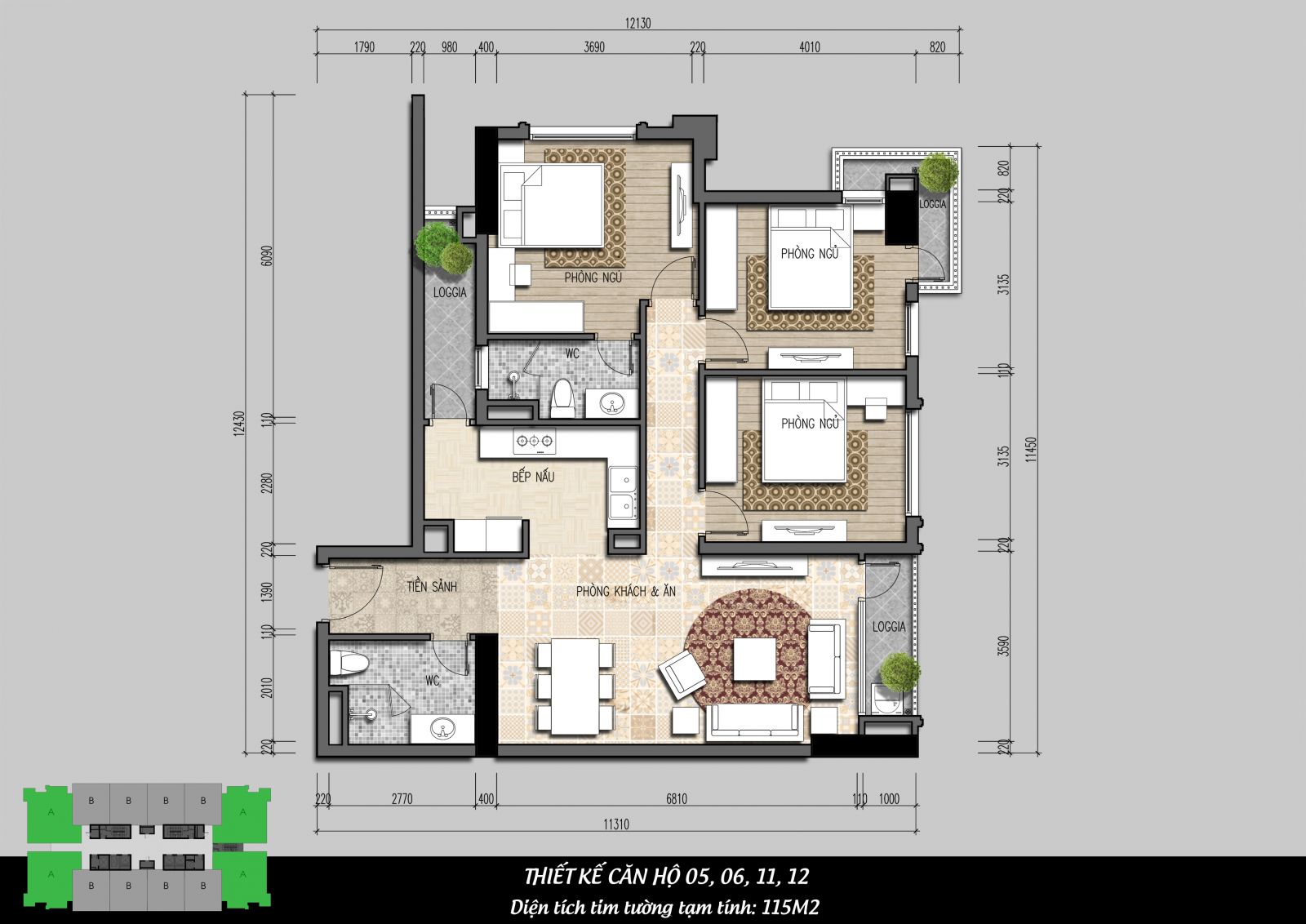 + Căn hộ 3 phòng ngủ: 103,9 và 131,8 m2