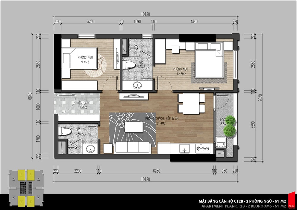 + Căn hộ 2 phòng ngủ: 60,7 và 61,1 m2