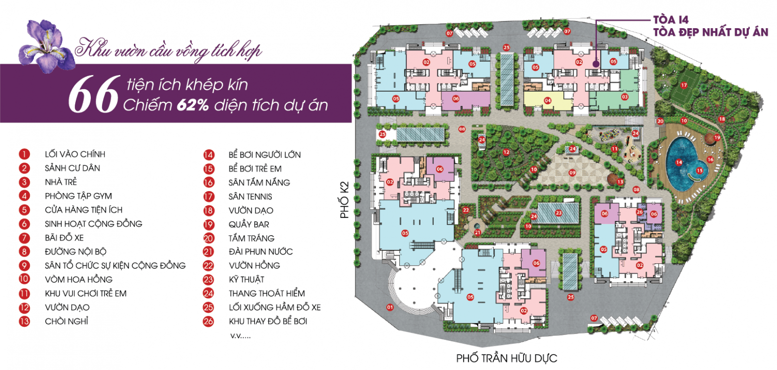 Tiện ích: 66 tiện ích: bể bơi 4 mùa, sân tennis, nước uống tại vòi,khu thể thao,vui chơi trẻ em,gym,spa…