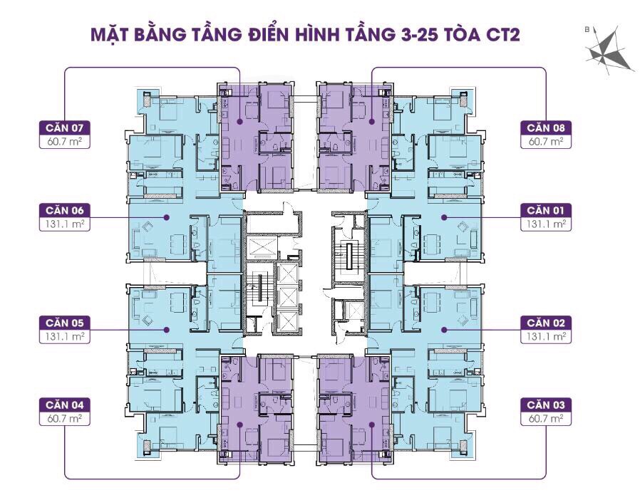 Toà CT02 thiết kế cao 25 tầng. Diện tích từ 61m2 - 131m2 ( 2-3PN)