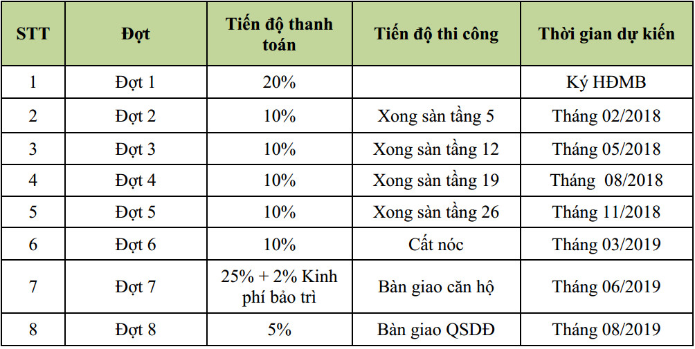 Đóng 20% GTCH ký Hợp đồng mua bán.Bàn giao nội thất hoàn thiện: Điều hòa, bình nóng lạnh, trần thạch cao …